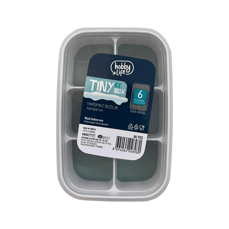 قالب یخ مدل Tiny ice box قابلیت شکل دهی به 6 عدد یخ را دارد. بدنه اصلی این قالب از جنس پلاستیک کاملا بهداشتی و فاقد BPA ساخته شده اما در قسمت زیرین قالب و در واقع یخ های تشکیل شده دارای لایه ای نرم و سیلیکونی است که خارج سازی یخ های ساخته شده را بسیار آسان می سازد. ابعاد این قالب یخ 11*7.5*3.5 سانتی متر است که یک قالب یخ سایز کوچک محسوب می شود.