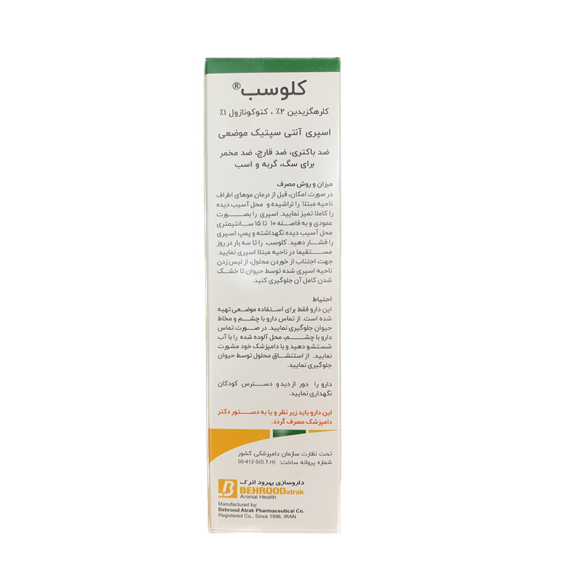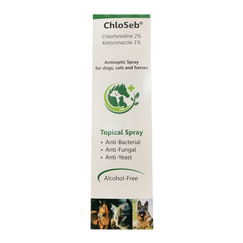 ChloSeb® یک اسپری موضعی برای سگ، گربه و اسب است که حاوی کلرهگزیدین (ضد باکتری) و کتوکونازول (ضد قارچ) است. بدون الکل است و در درمان اختلالات و عفونت های پوستی مفید است.